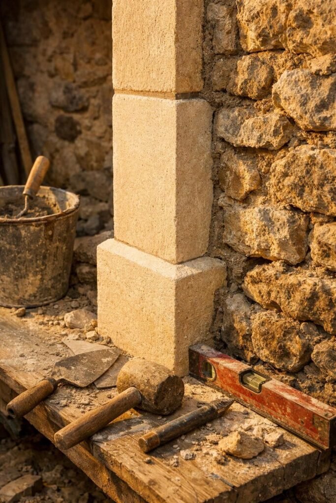La création d’un jambage s’appuie sur deux grandes méthodes : la reprise traditionnelle « pierre par pierre » et la technique contemporaine du jambage coffré en béton.